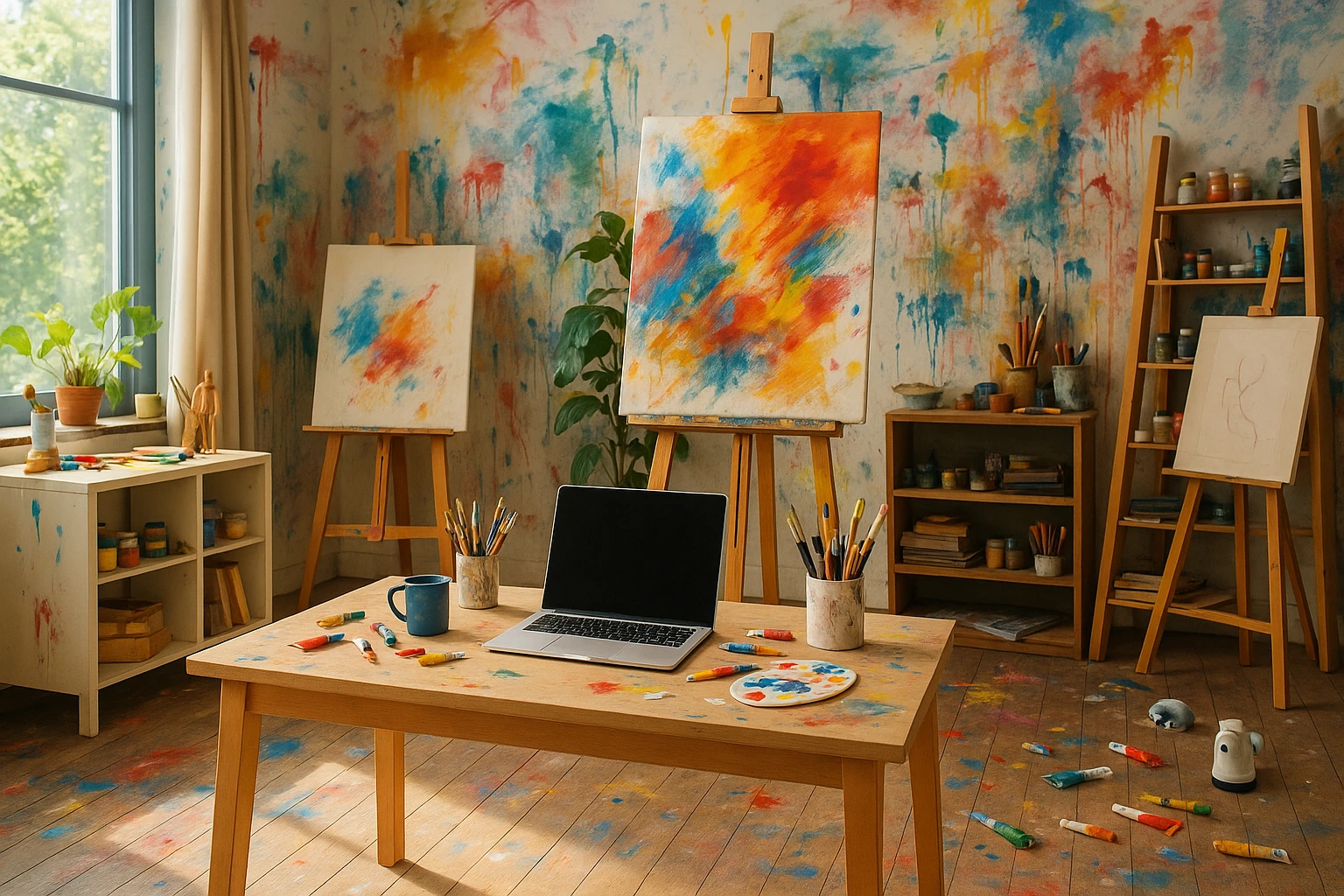Description: A colorful artist’s studio with paint splatters, easels, and creative chaos around clean workspace.