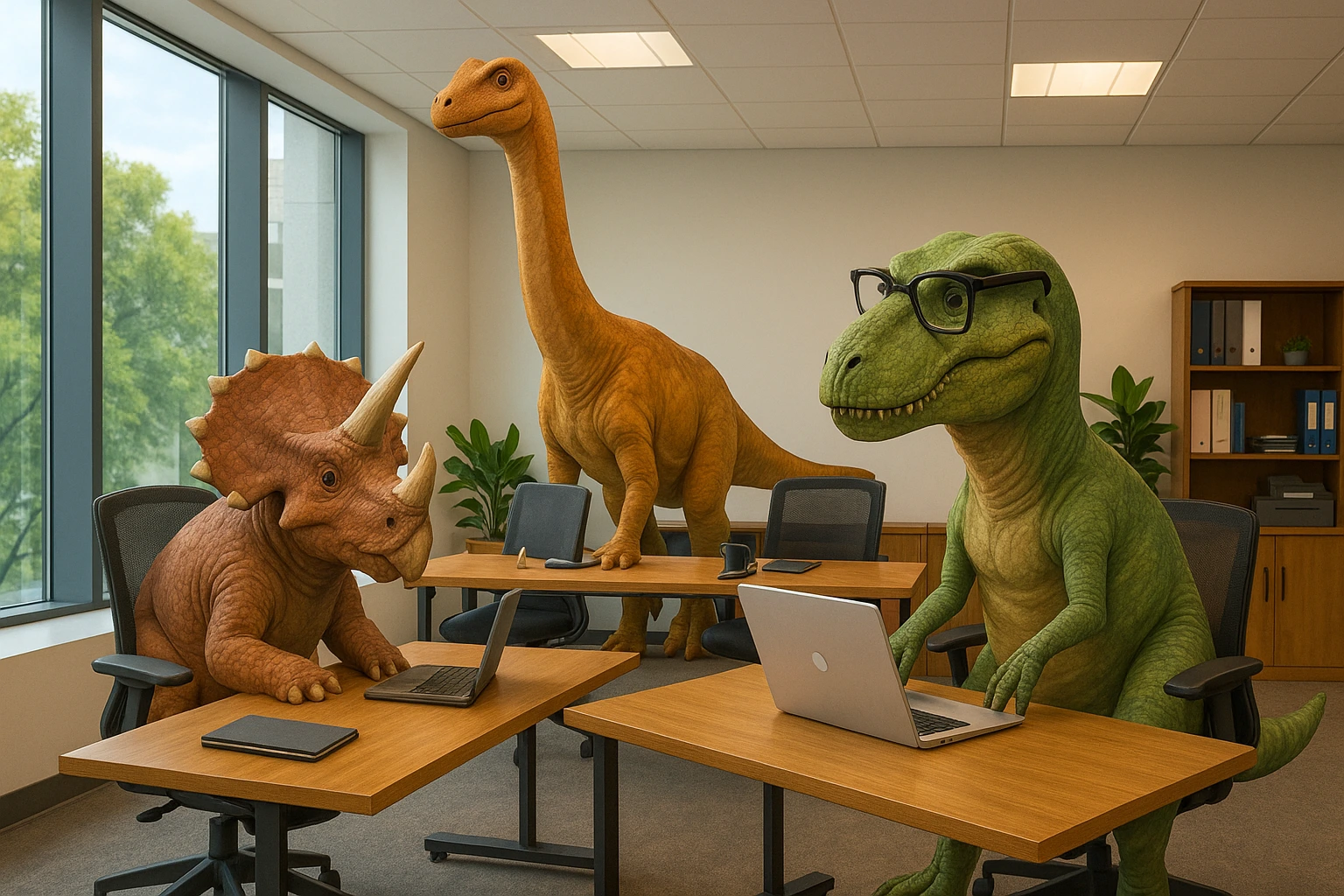 Description: A modern office where friendly dinosaurs are coworkers, including a T-Rex wearing glasses at a computer.