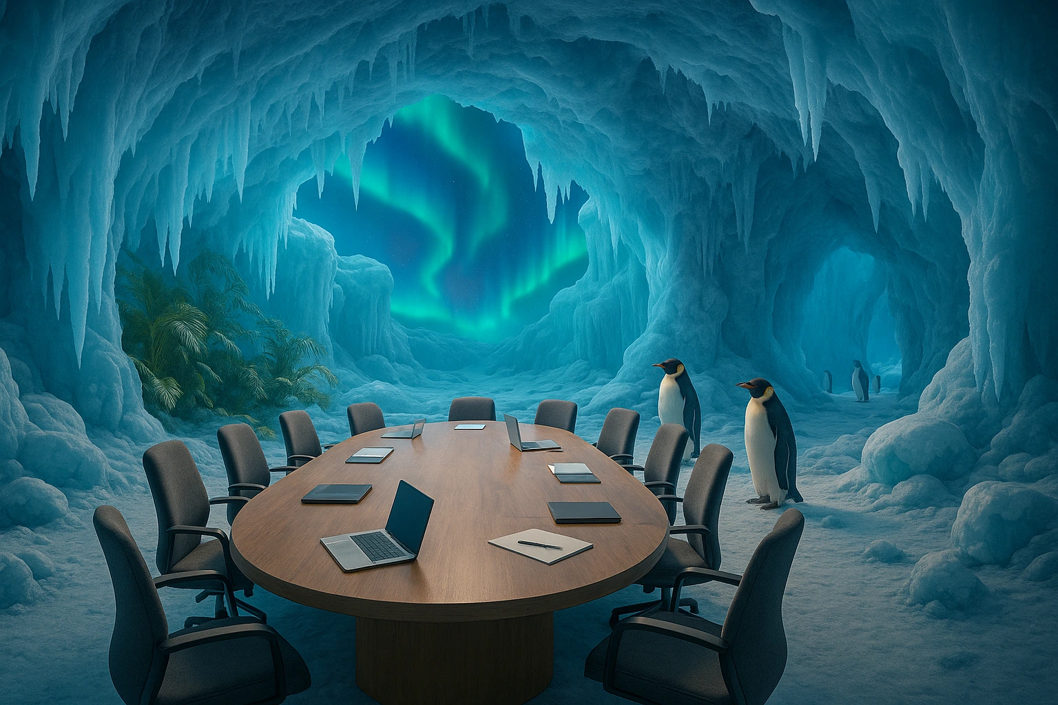 Description: An elegant ice cave meeting room with icicles, aurora lights, and penguins as attendees.