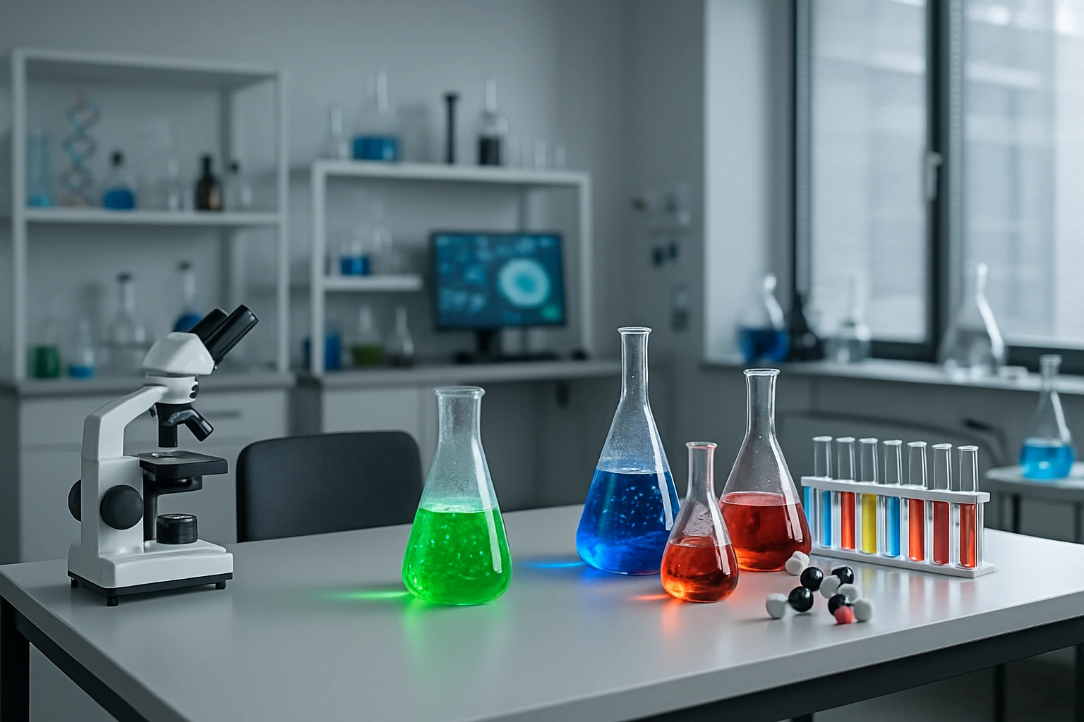 Description: A bubbling laboratory with colorful experiments and scientific equipment backdrop.