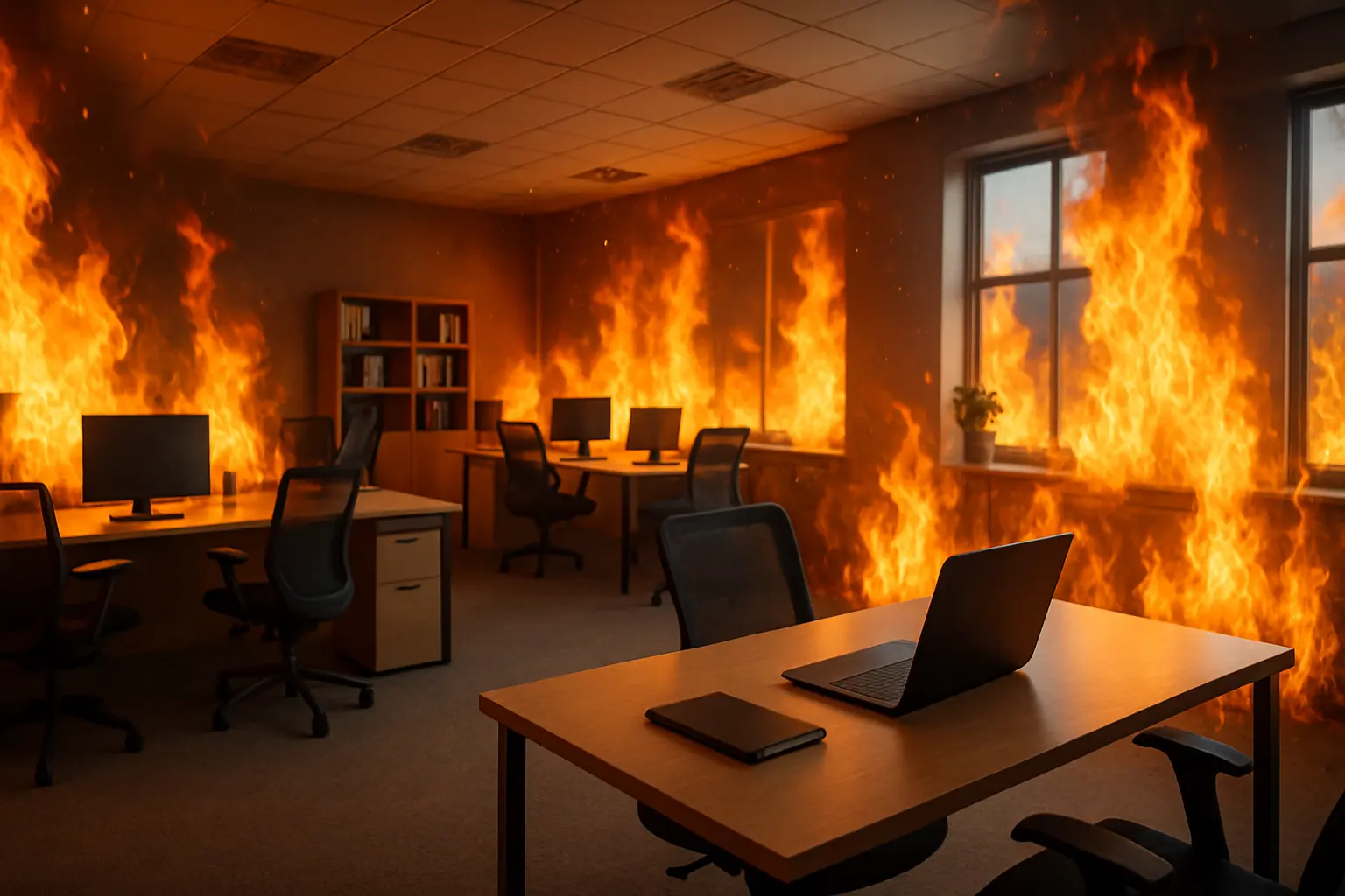 Description: A perfectly normal office setting with everything subtly on fire in the background, channeling the famous “This is Fine” meme.
