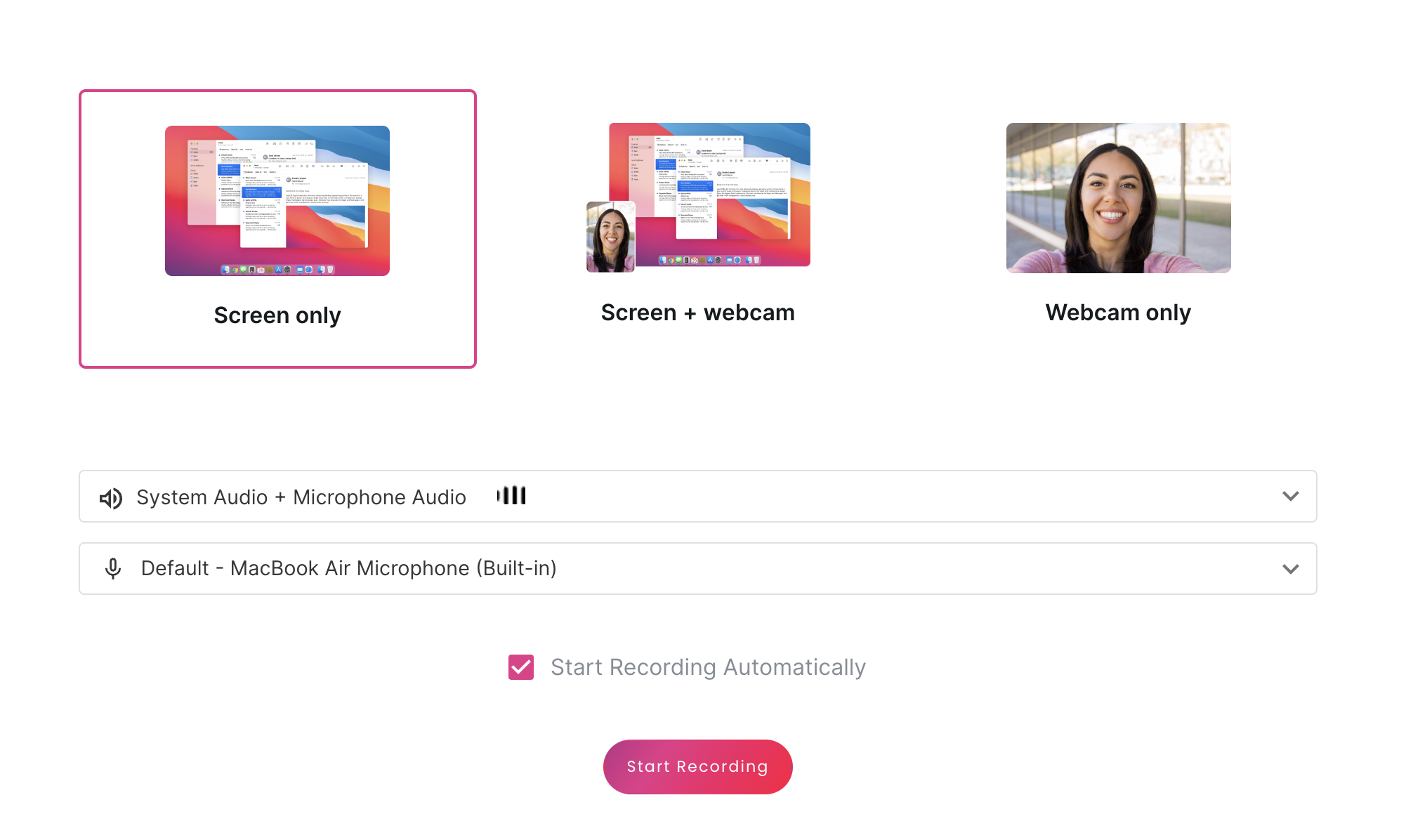 - Selecione o tipo de gravação que você deseja criar - ‘Somente tela’, ‘Tela mais Webcam’ ou ‘Somente Webcam’.