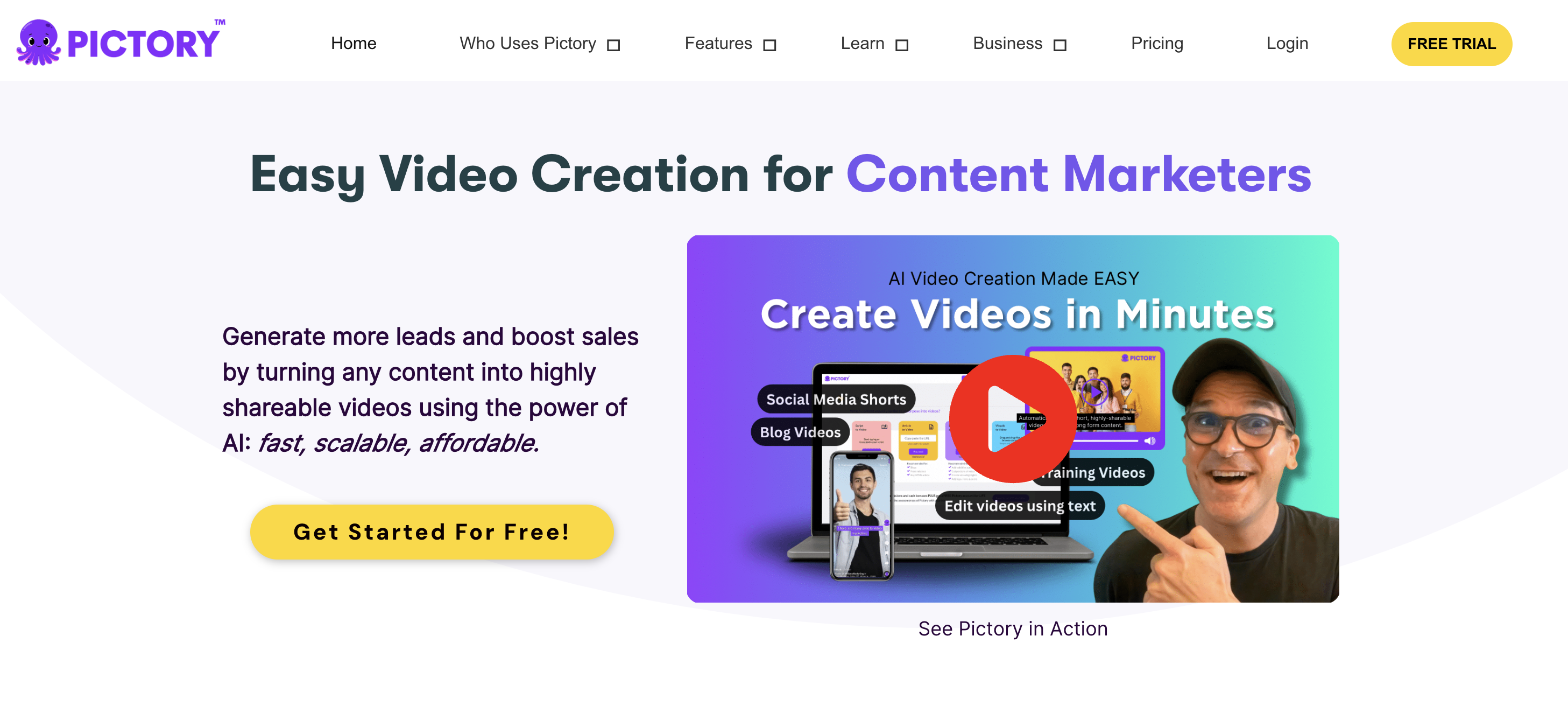 - Short Summary: Pictory excels at turning long-form content like articles, scripts, or webinars into engaging short-form videos. It automatically creates highlight clips, adds visual elements, and incorporates text overlays.