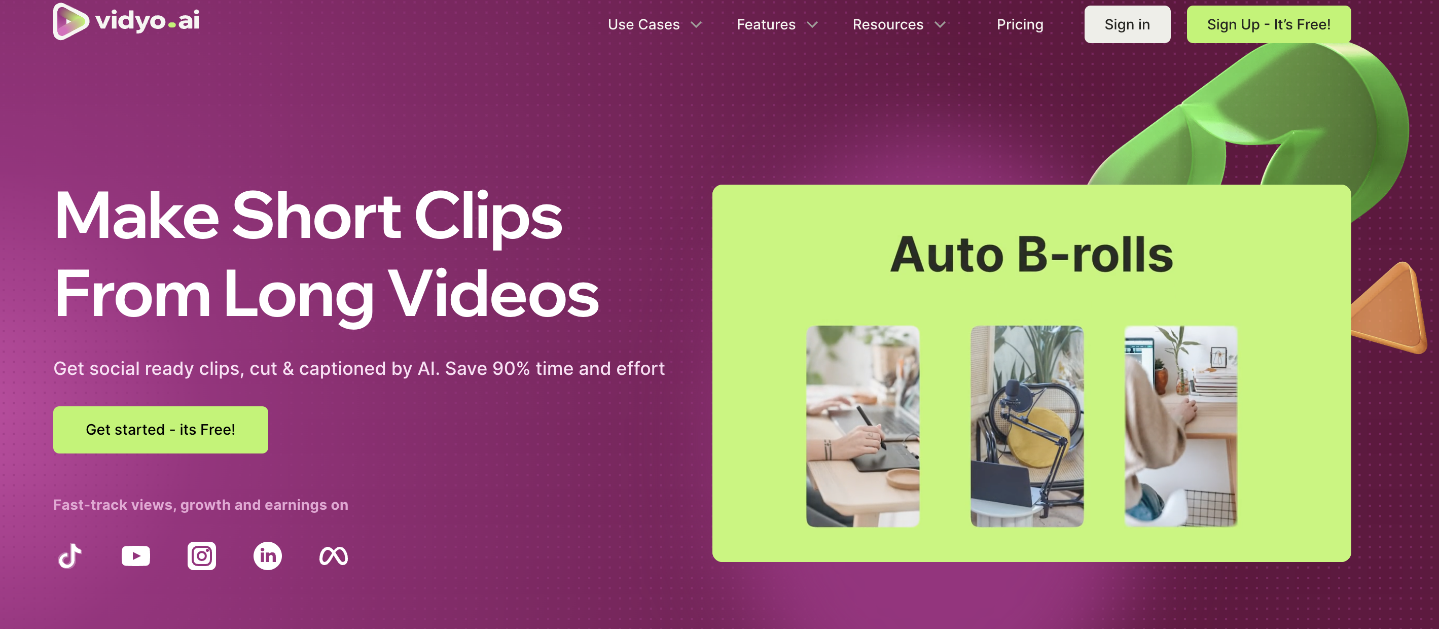- Short Summary: Vidyo.ai is focused on generating personalized videos at scale. It uses AI to combine existing video clips with custom text or data, creating unique videos for various use cases.