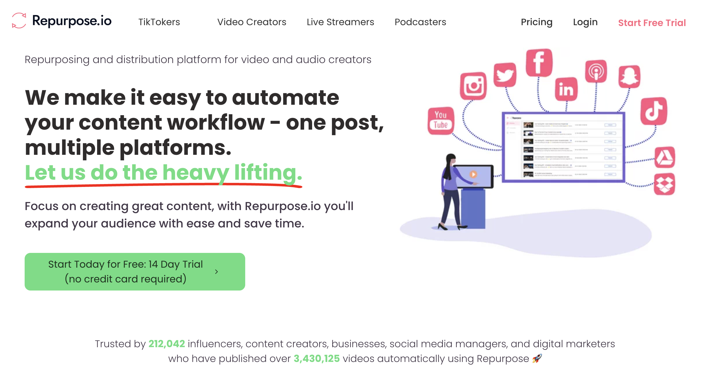 - Short Summary: Like its name suggests, Repurpose.io is all about transforming long-form video and audio content into various formats. It can create highlight clips, social media snippets, and audiograms.
